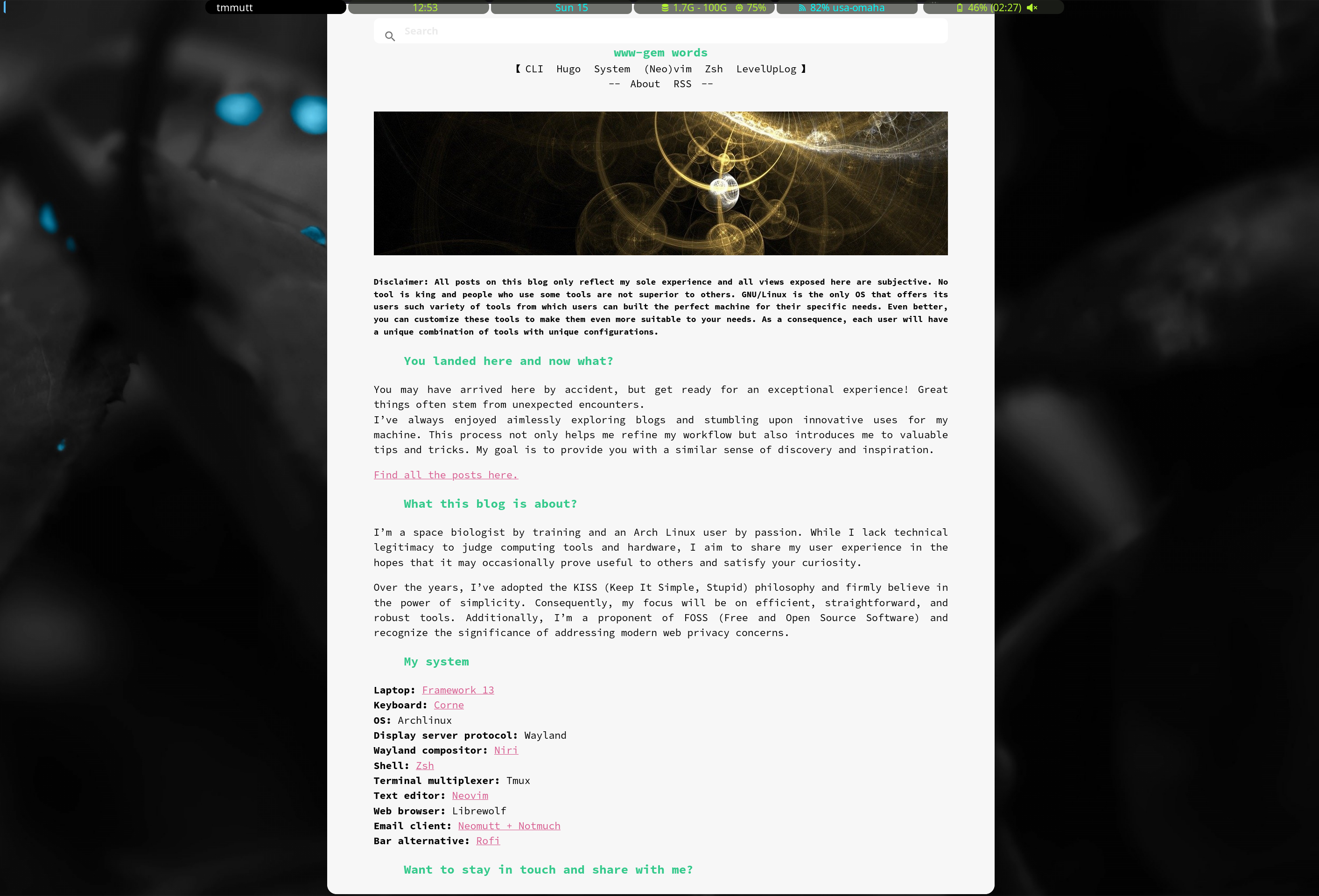 for almost everything on my system. This is done using the power of scripts. I’m also using Rofi as a temporary bar to show my system information (time, disk usage, network status, battery…).